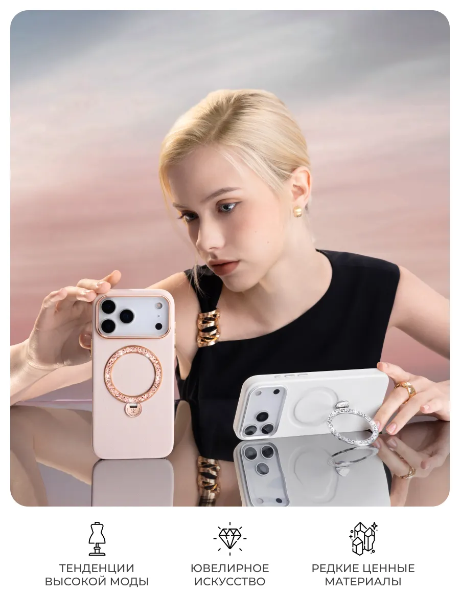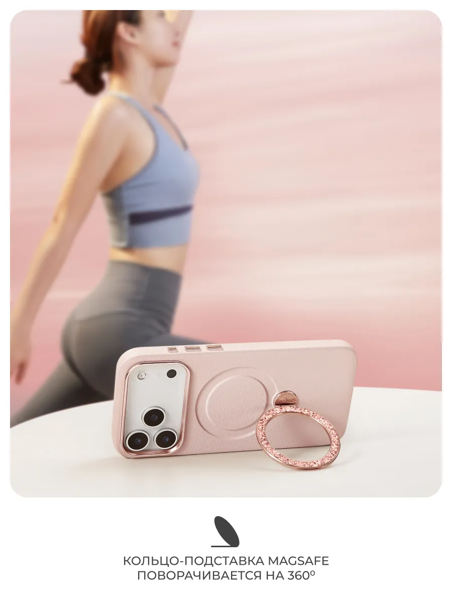 Главный акцент — кольцо MagSafe с алмазной гравировкой. Его блеск притягивает взгляды, а плавное вращение на 360° делает использование смартфона невероятно удобным: чехол легко превращается в подставку и комфортно лежит.