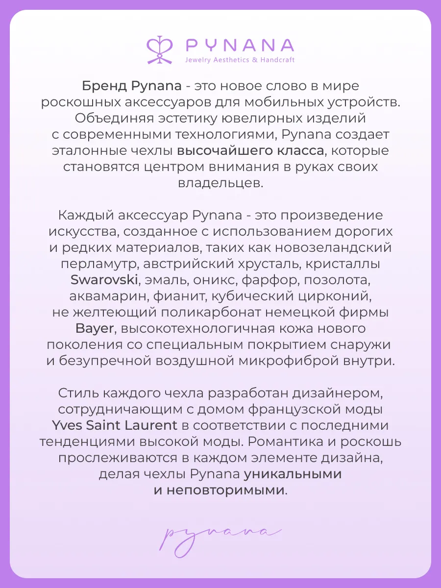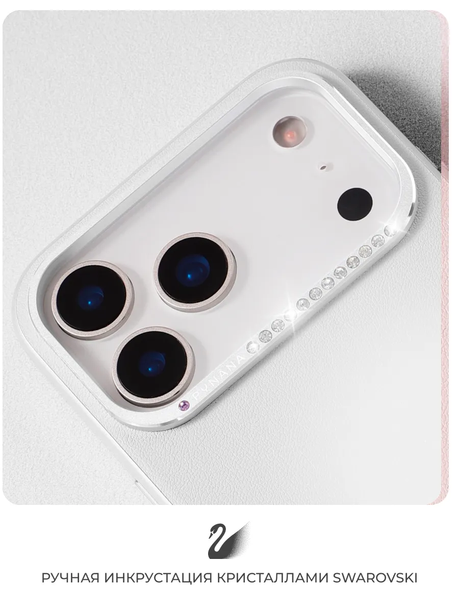 Главный акцент — металлическая рамка блока камеры, инкрустированная кристаллами Swarovski. Их сияние напоминает звёздную россыпь, отражающую свет в десятках бликов. Чехол мгновенно притягивает внимание и подчёркивает безупречный вкус владелицы.