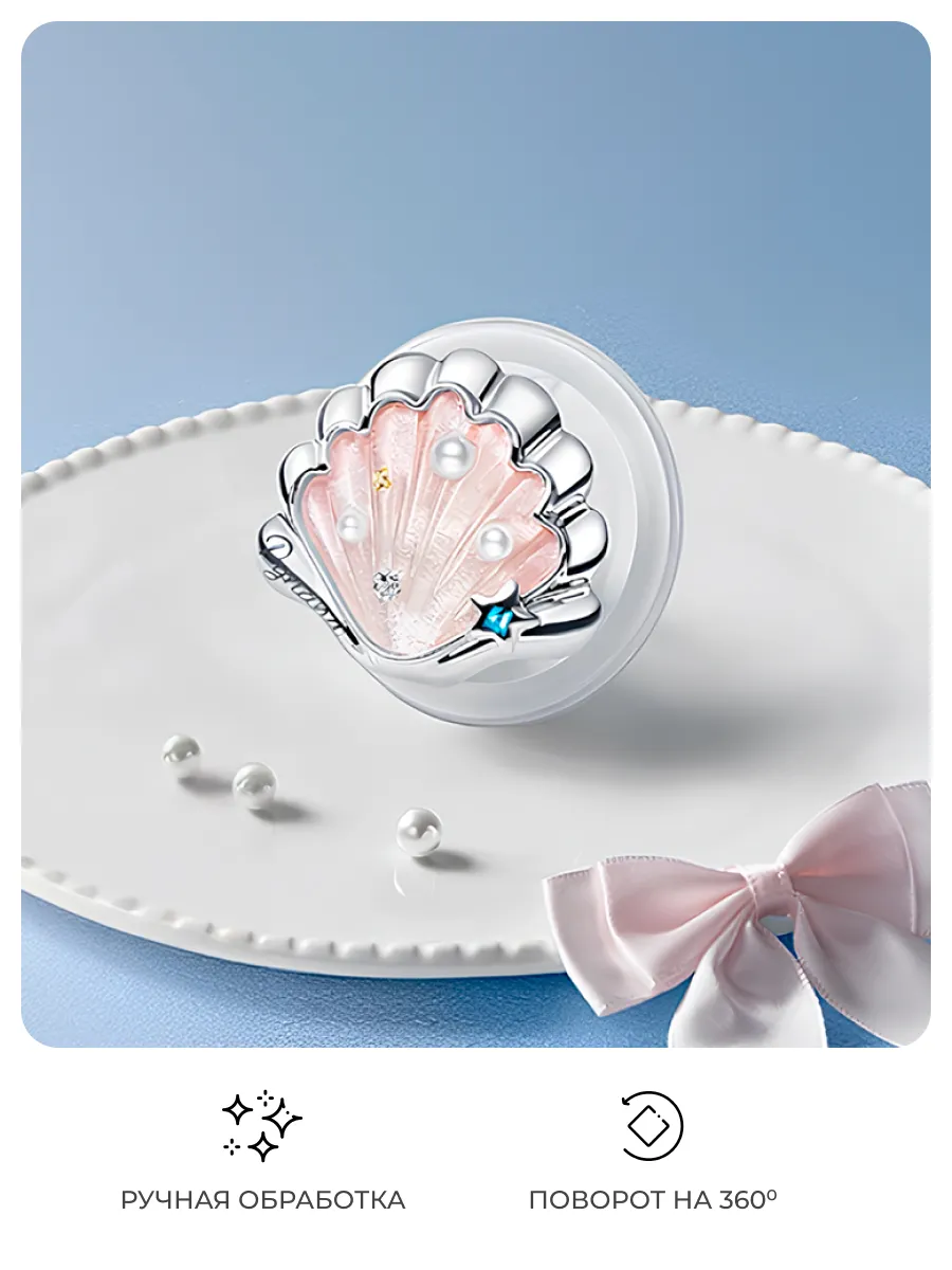 Pynana RoséShell MagSafe Grip — это попсокет, вдохновлённый морем и нежным свечением перламутра. Его форма повторяет изящные линии раковины, а мягкий розово-серебристый оттенок переливается, словно отблеск заката на поверхности воды.