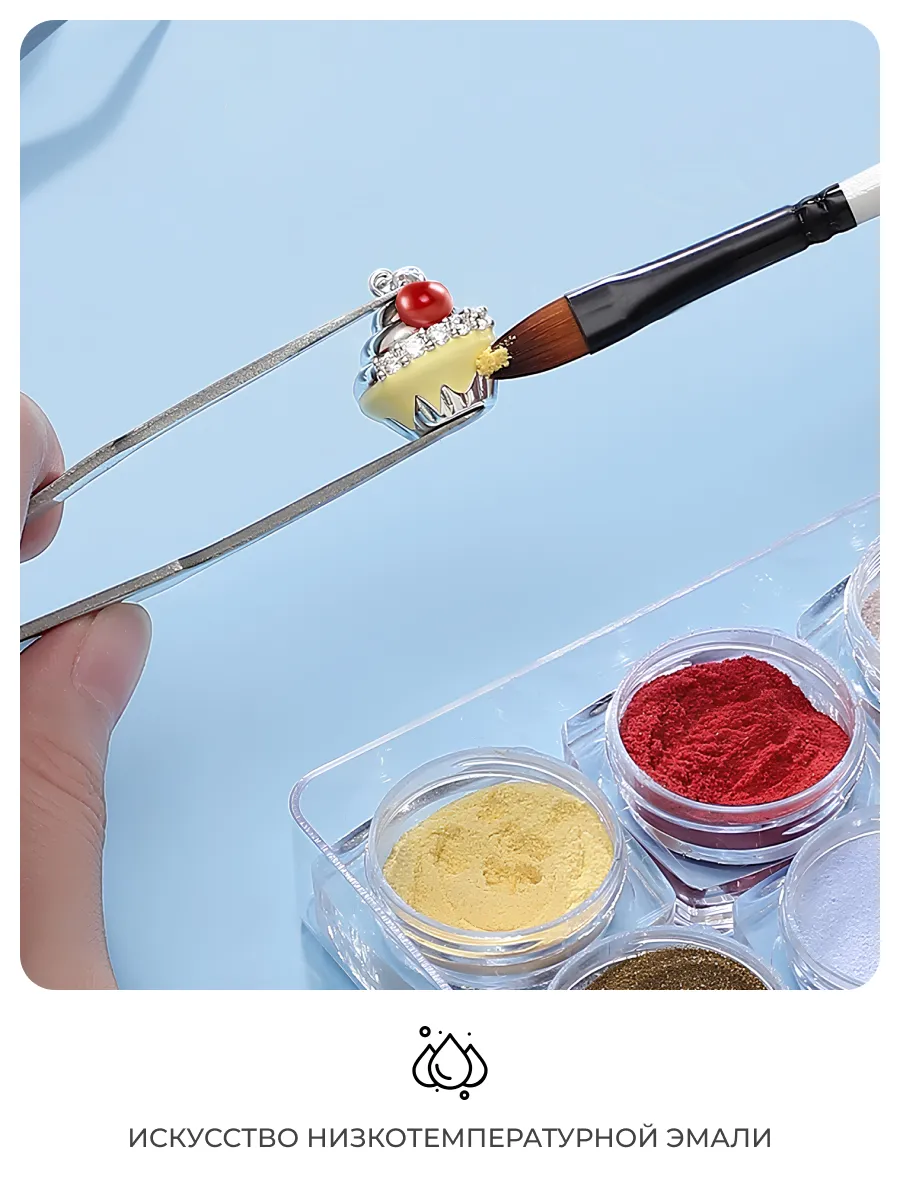 В центре композиции — подвеска в форме кекса с вишней, покрытая глянцевой эмалью и украшенная кубическим цирконием, инкрустированным вручную. Его сияние напоминает сахарные кристаллы на свежем десерте. Металлические элементы покрыты белым золотом, которое защищает поверхность от потускнения и придаёт изысканный блеск.
