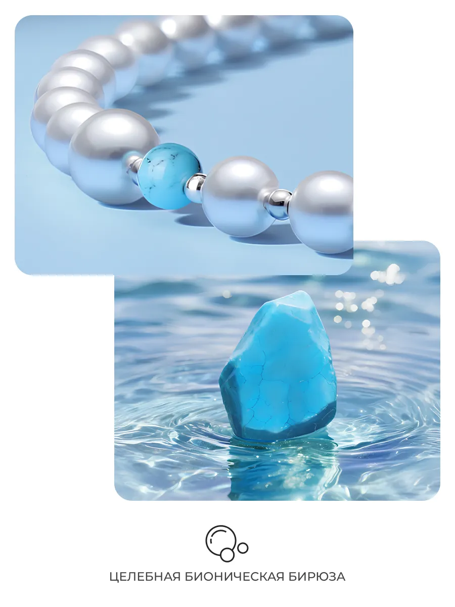 Особую энергию цепочке придаёт бирюза — древний камень исцеления, известный своей способностью снимать стресс, укреплять интуицию и дарить внутреннюю гармонию. Её мягкий небесный оттенок приносит спокойствие, защищает от усталости и наполняет день лёгкостью.